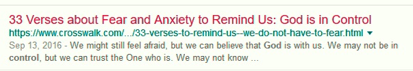 So, if you read them, none of them are about God being in control. Oh, they say "do not fear" and "trust in the Lord", but none say that God is in control. What does it mean that we ask about God being in control, and they answer some question we didn't ask? They go on to talk about keeping the peace of God in your heart, love without fear, don't worry about tomorrow, but these have nothing to do with God being in control. Are they trying to change the subject? Why even give us this answer?