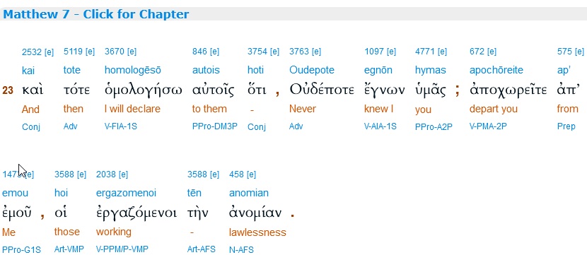 , and act accordingly. Actually, the Greek uses a word in Matthew 7:23 that the NIV mistranslates. The word evildoers is a mistranslation of the Greek words for those working lawlessness: