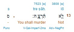 The phonetic spelling for the Hebrew term tre-sah (murder) is raw-tsakh' (sounds like rotsackh ending with the breathy 'h' sound, and it means to murder or slay). The Hebrew word for "kill" sounds like laharogue (la-ha-rohg). They are not the same word.