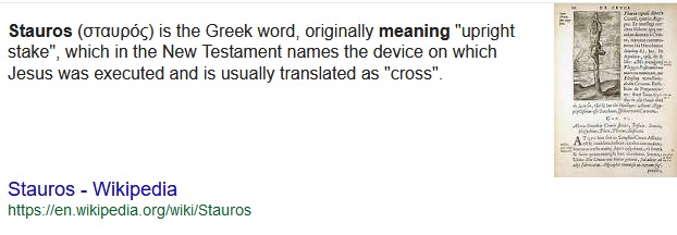 So, while you can find anything you want online, make sure it fits with actual history and knowledge with facts rather than an opinion. Both the second Wikipedia article above and the New World Encyclopedia say the same thing when discussing the meaning of the word stauros to be a stake or pole, but then confuse the definition with modifications based on traditions or guesses regarding history. Their statement regarding the stake is confirmed by the Bible that my wife and I use - The Complete Jewish Study Bible, written from a Jewish perspective. However, adding the opinions of 16th- and 17th-century "Christians" only clouds the issue so it can better match the opinions of today's "Christians". If you read what the Bible actually says, without adding interpretative explanations, you can keep the truth simple and make sure it fits the whole story.