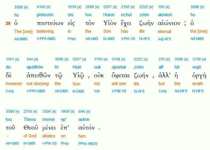 ) Actually, if you look at the Greek, it does not limit the required action to believing in Jesus, but adds a requirement that many Christians miss. While hovering over the John 3:36 link above, look at the word that is translated in the NIV as "rejects" and in the KJV as "believeth not":