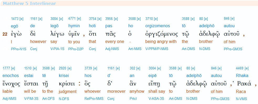 22"But I tell you that anyone who is angry with a brother or sister will be subject to judgment. Again, anyone who says to a brother or sister, 'Raca,' is answerable to the court. And anyone who says, 'You fool!' will be in danger of the fire of hell.