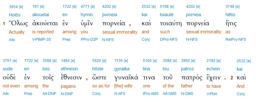 1It is actually reported that there is sexual immorality among you, and of a kind that even pagans do not tolerate: A man is sleeping with his father's wife. 2And you are proud! Shouldn't you rather have gone into mourning and have put out of your fellowship the man who has been doing this? 3For my part, even though I am not physically present, I am with you in spirit. As one who is present with you in this way, I have already passed judgment in the name of our Lord Jesus on the one who has been doing this. 4So when you are assembled and I am with you in spirit, and the power of our Lord Jesus is present, 5hand this man over to Satan for the destruction of the flesh, so that his spirit may be saved on the day of the Lord.