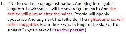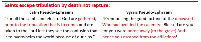 Notice that the one on the right (Syrian) actually agrees with the rest of the text of the same document that mentions the saints being persecuted, except those who escaped through death, which cannot happen if they are raptured out of the tribulation. When a document contradicts itself (as does the Latin version), it is difficult to accept as any sort of proof.