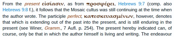 Also, commentary authors like the one in Meyers NT Commentary show that most Bible versions dishonestly show the use of the word "entered" (as in past tense like "went") used in verses like Hebrews 9:6-7